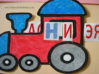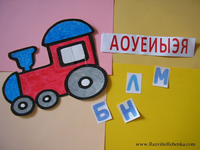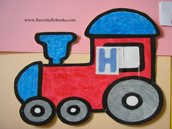 Для своей дочери я распечатала паровозик и сама его раскрасила. Затем аккуратно лезвием или ножом делаем два надреза по краям окошка паровозика. Туда мы будем вставлять ленту с гласными буквами.